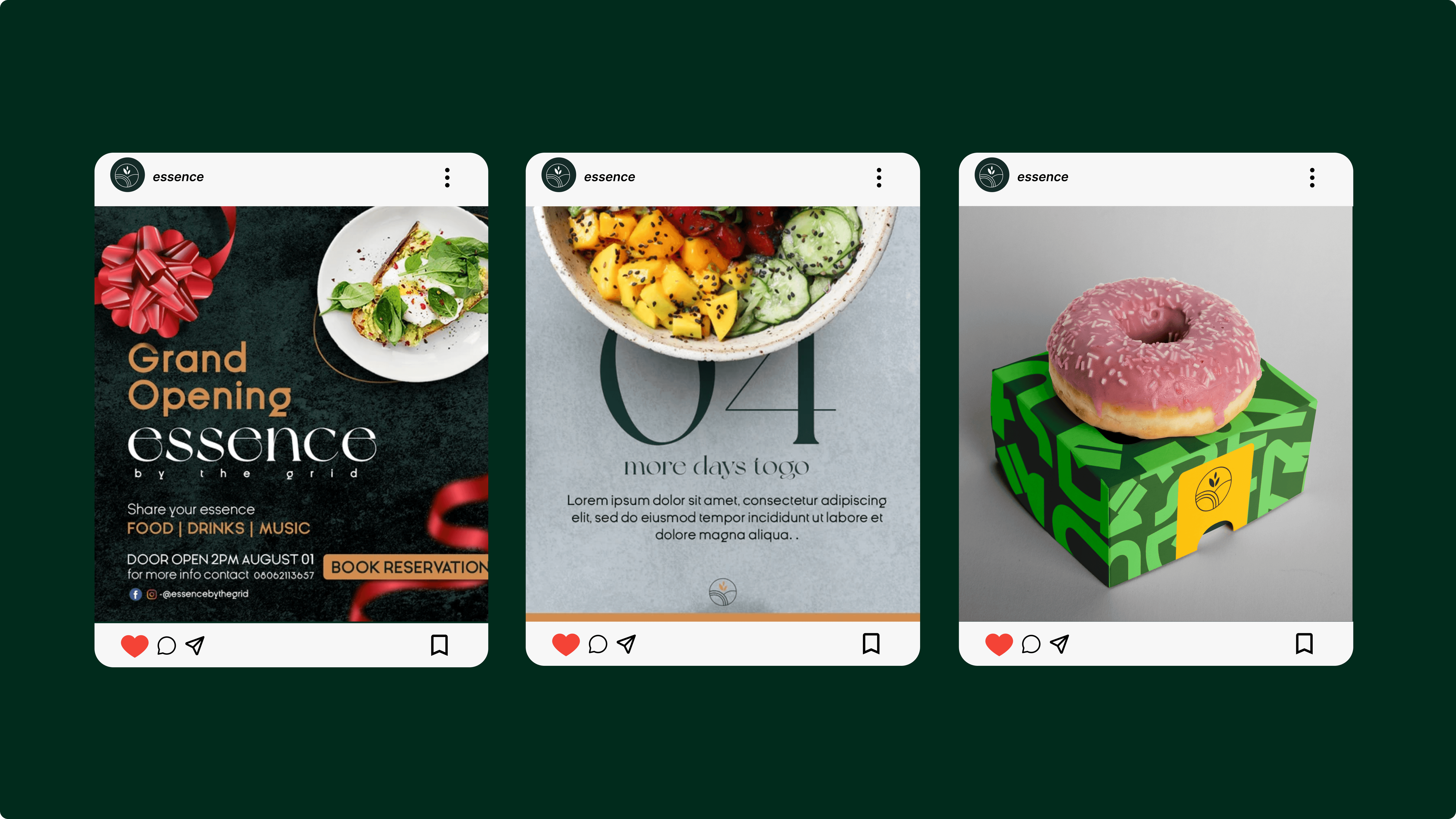 Essence was birthed from the thought that “an exquisite dining experience should be well within reach of the residents of the mainland of Lagos.” With a visual identity that stimulates diners’ senses even before they sight their platters, an ambiance of affordable dining luxury and sating moments simmers to life. Filled with life’s essence. The visual identity is inspired by elements of essence found in nature. The logo borrows spice from the sun, moon, and plant life to denote the warm, aesthetic, and invigorating dining experience Essence offers. And for a complementary garnish, the wordmark is rendered in the wholesome flourishes of New York.