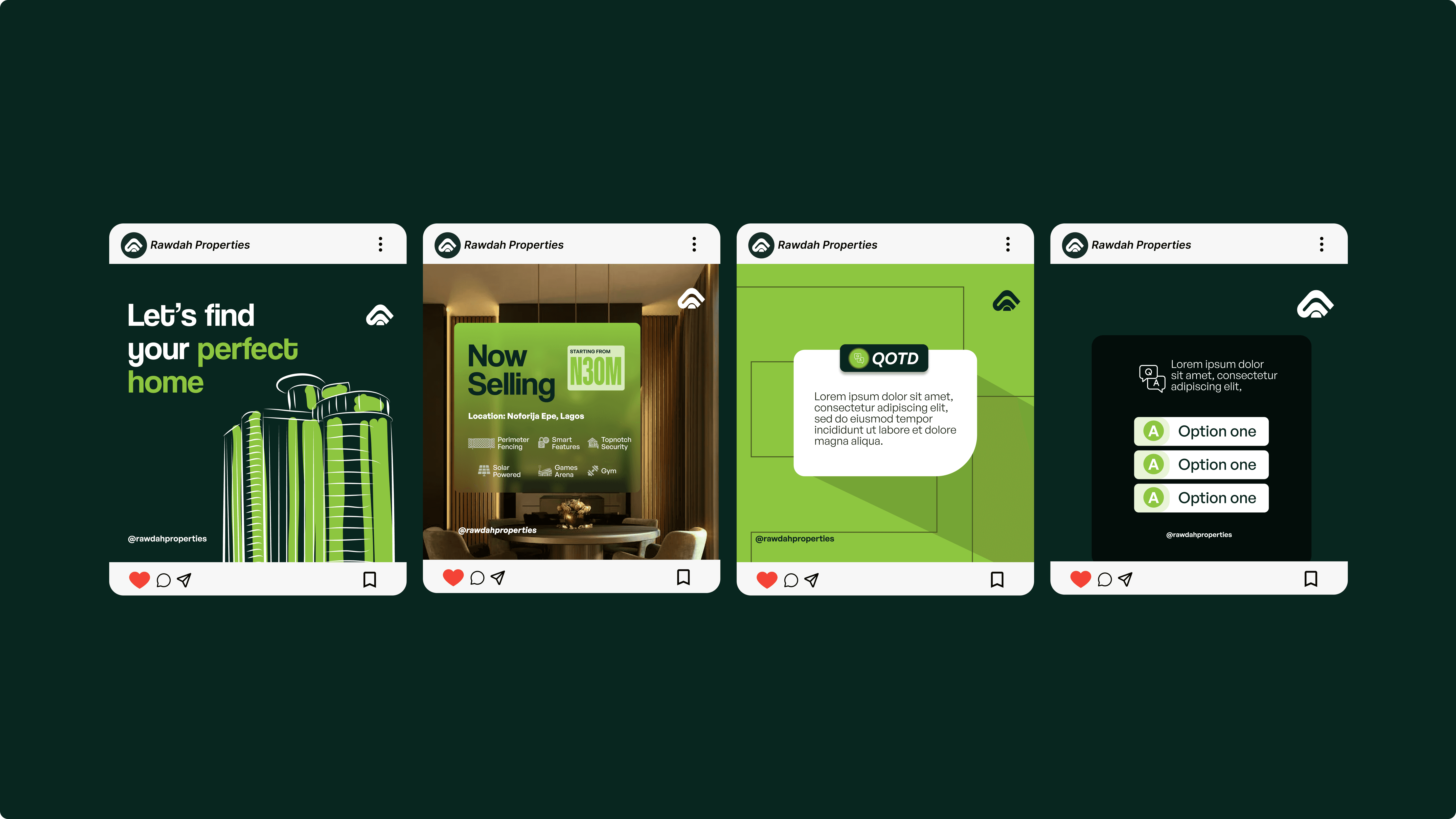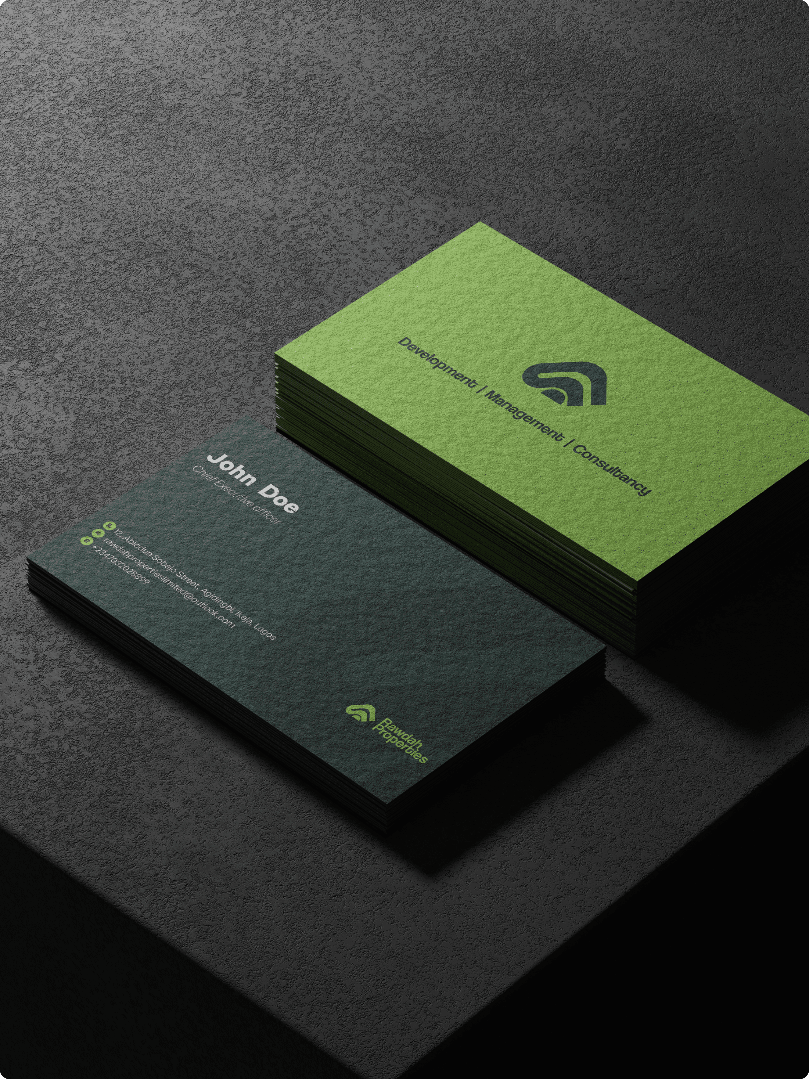 Rawdah Properties enters Lagos’s mainland market with a clear mission: prove that eco-friendly, affordable, and durable homes can coexist. In a sea of look-alike developments, Rawdah offers residents both the peace of mind that comes from rock-solid construction and the pride of living in a genuinely sustainable community. Shaping a Friendly Signature Our logo mark folds the letter “R” into a house silhouette—its layered strokes hint at both brand and shelter, while the overall form feels open and inviting. We paired this with Coolvetica, a geometric, condensed slab that reads modern and futuristic yet retains a touch of class. A vibrant palette of forest green (for foliage and eco-cred) and lemon (for warmth and optimism) brings the identity to life, and a blown-up fragment of the icon repeated as a soft background pattern ties every application—from brochures to web banners—into a cohesive whole. Nature’s Geometry Meets Modern Homes Drawing from the precise angles of architectural blueprints and the organic curves of leaves, we struck a balance between human-centric warmth and engineered reliability. The friendly house-R shape feels both familiar and fresh, while our green-and-lemon palette underscores Rawdah’s commitment to planet and people.